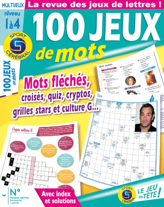 Pour vous qui aimez autant jouer avec les mots que lire ou même écrire, 100 jeux de mots de Sport Cérébral® est une source de loisirs incomparable. Ici, honneur aux lettres : vous ne rencontrerez aucun jeu de chiffres. En revanche, des heures de jeux vous sont garanties : la part donnée aux mots fléchés y est belle, qu’ils soient classiques ou à dingbats, codés, star, thématiques et même casés… Un panaché d’extraits codés, de chassés-croisés, de textes à la trace libèrent, une fois résolus, des univers littéraires variés. Bonus non négligeable : des quiz d’art, d’histoire, de cinéma et de littérature vous permettent de tester votre culture générale. Votre créativité peut s’exprimer, entre deux mots croisés, dans les ateliers d’écriture dispatchés au fil des pages. Quant à la rubrique Testez votre français, elle précisera vos acquis par le jeu.