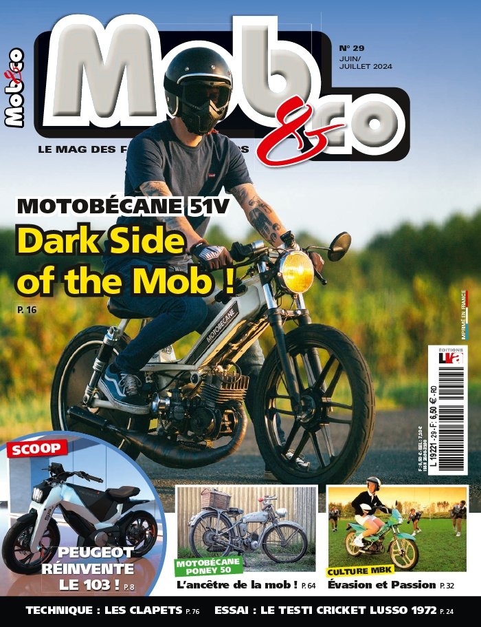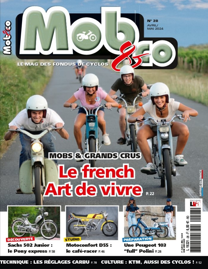 Le magazine Mob&Co s’adresse aux passionnés de l’univers du cyclo : amateurs, collectionneurs, clubs, mais aussi professionnels. Tous les deux mois, votre magazine vous propose des essais cyclos, des papiers d’histoire, de belles photos studio, la présentation d’une mob qui sort de l’ordinaire, de rencontrer les adhérents d’un club, sans oublier la cote, des portraits de collectionneurs, les manifestations à ne pas manquer, des petites annonces… Bref, tout un programme !