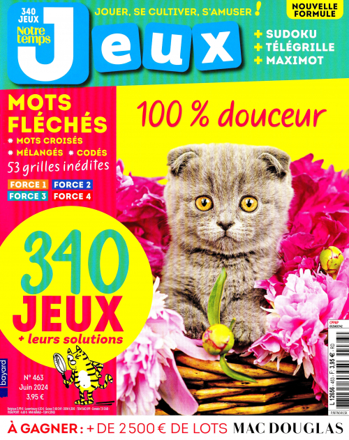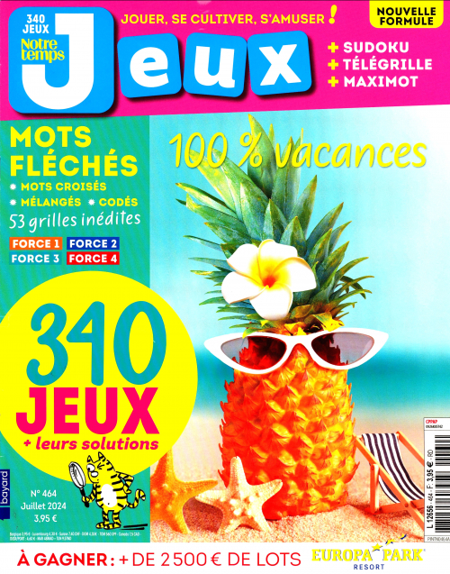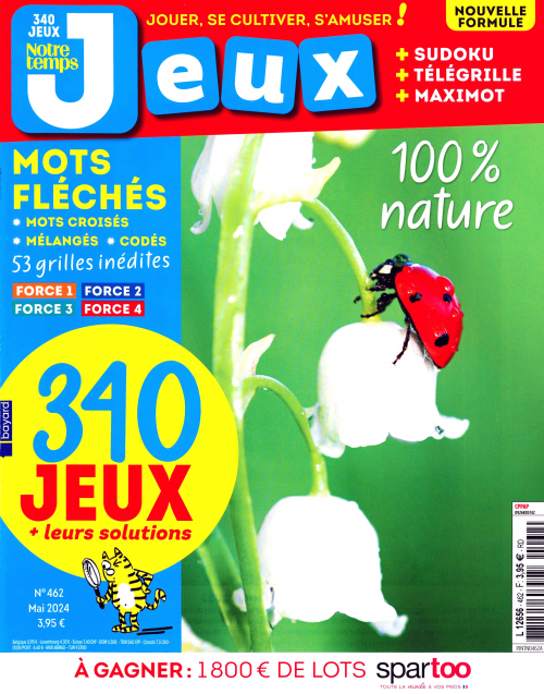 Notre Temps Jeux change pour vous offrir encore plus de pages, de grilles, de jeux et de lecture : idéal pour travailler et améliorer votre mémoire tout en vous amusant ! Chaque mois 220 jeux variés et leurs solutions pour tous niveaux, du débutant au confirmé, vous attendent dans Notre Temps Jeux : Des mots fléchés, des mots croisés, des mots mélangés, des mots codés, des sudoku, des anagrammes, des télégrilles, des mots-zaïc… Notre Temps Jeux c’est aussi des jeux-concours avec de nombreux lots à gagner et de l’évasion grâce aux rubriques Voyages et Découvertes, Avec Notre Temps Jeux, offrez-vous des heures de jeux pour vous distraire en vous cultivant !